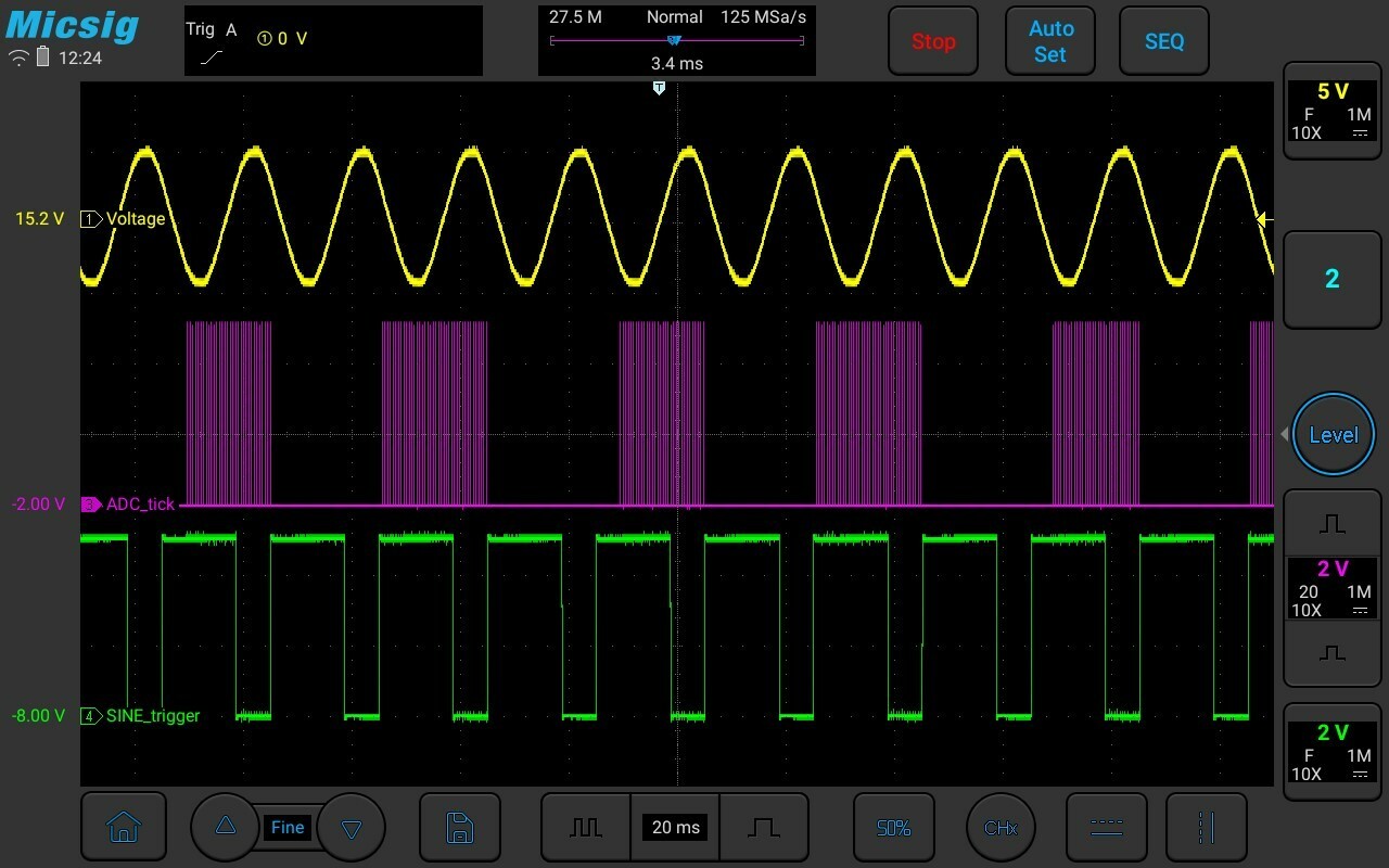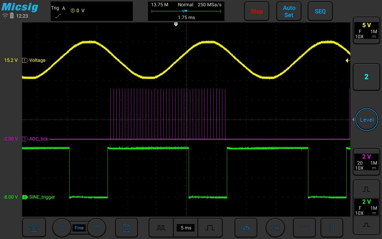 Общая осциллограмма процесса измерений показывает, что начало цикла измерений периода синусоиды («Voltage», канал № 1) начинается с появления переднего фронта на выходе компаратора («Sine trigger», канал № 4). После появления переднего фронта начинается цикл периодических измерений АЦП («ADC tick», канал № 3) который останавливается при появлении следующего переднего фронта компаратора после начала преобразования.