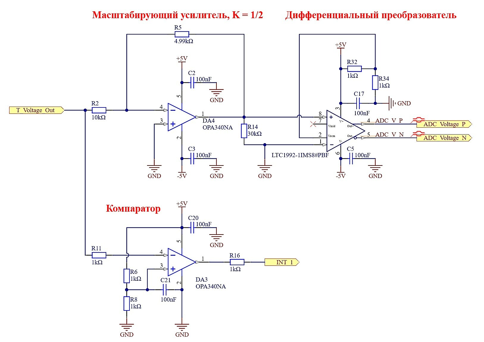 к шумам и помехам в условиях работы промышленного сильноточного оборудования и поддерживается встроенным в МК модулем АЦП. Схема масштабирующего дифференциального усилителя приводит напряжение вторичной обмотки трансформатора напряжения к динамическому диапазону измерений АЦП (до ±2.5 В) и переводит сигнал из синфазного в дифференциальный. Компаратор DA3 используется для формирования сигналов начала и конца периода синусоиды переменного напряжения.