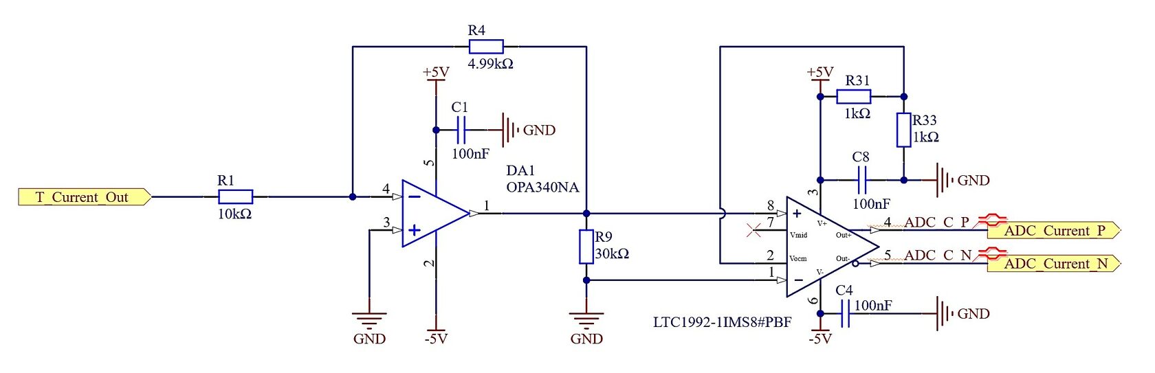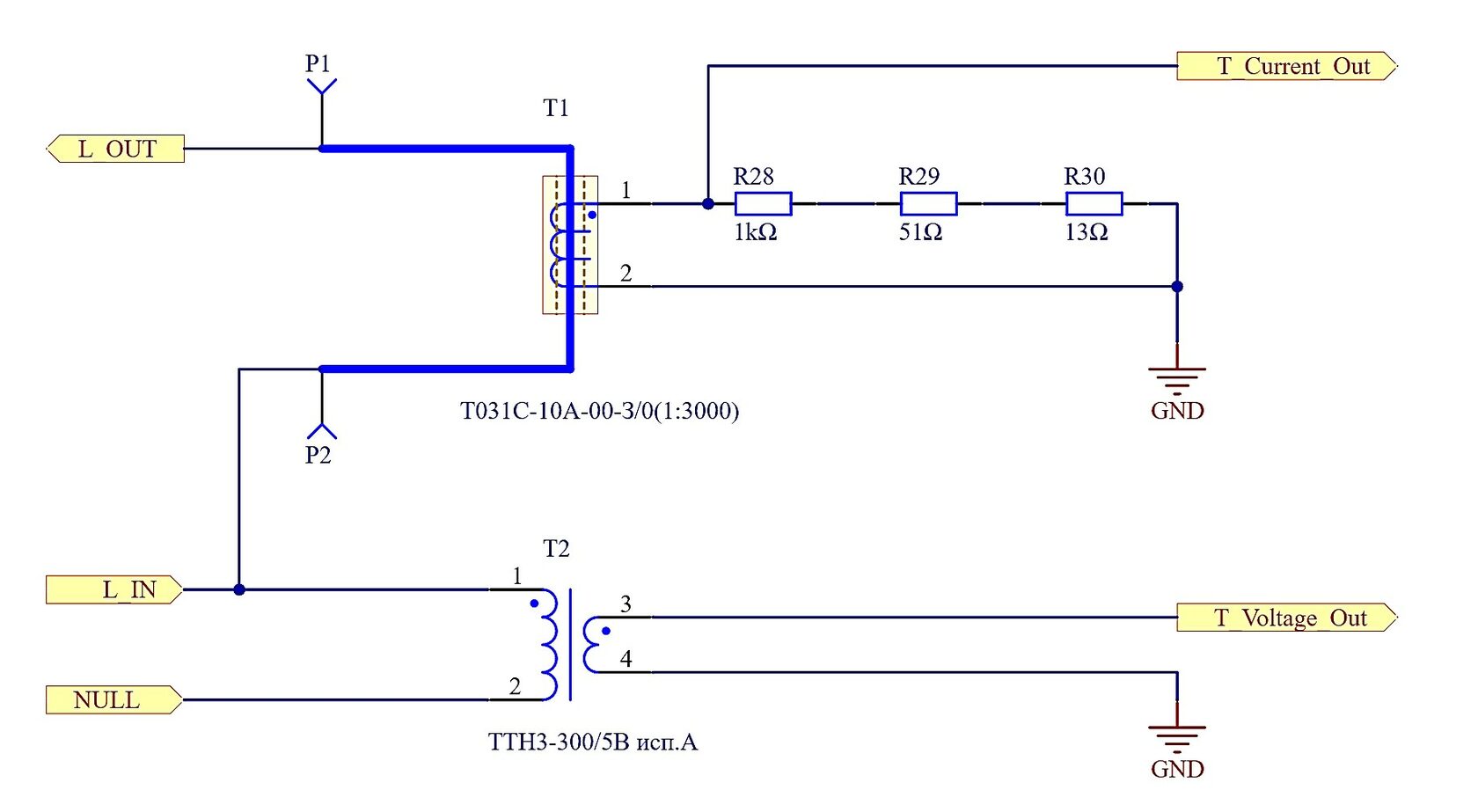Переменный ток нагрузки измеряется с помощью трансформатора тока Т1 Т031С-10А-00-З/0. Его потенциальный выход соединен с масштабирующим дифференциальным усилителем, соединенным на вход второго измерительного канала АЦП МК – канала измерения тока. Таким образом анализатор переменного тока АЦПн-10 компании Диалтек содержит