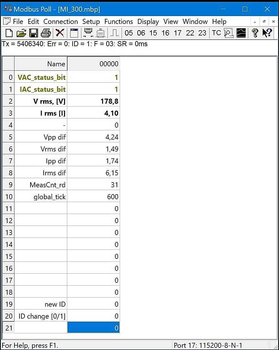 Регистр 2 регистровой карты модуля AЦПн-10 содержит результат измерений среднеквадратичного значения (RMS) напряжения в Вольтах, а регистр 3 — результат измерений среднеквадратичного значения (RMS) тока. Регистры 0 и 1 содержат статус биты наличия сетевого напряжения и токовой нагрузки. В случае отсутствия сетевого напряжения в регистре 1 появится значение «0», а при отключении нагрузки значение «0» появится в регистре 1. Также в модуле AЦПн-10 имеется возможность программной смены адреса Modbus RTU ID с последующим сохранением в энергонезависимую память.