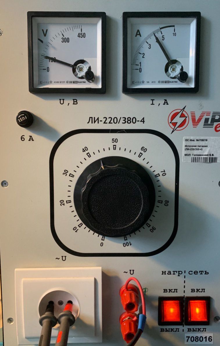 - автотрансформатор ЛИ-220/380-4 со стрелочной индикацией для плавного поднятия и изменения амплитуды переменного напряжения;