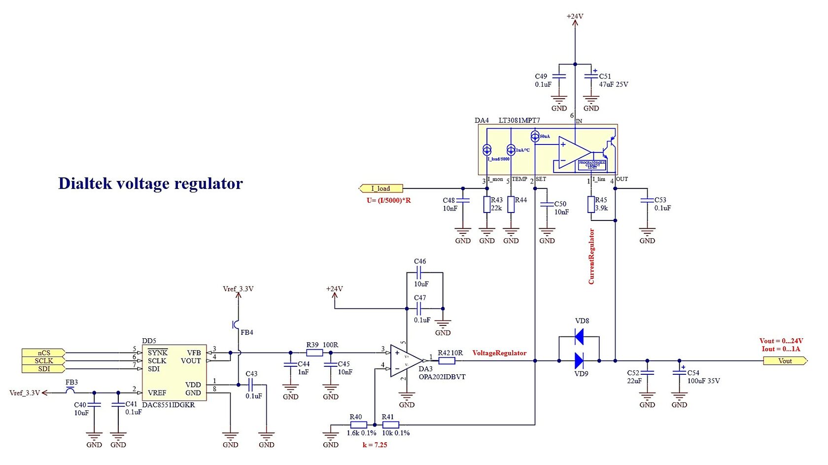 компанией ДИАЛТЕК была необходимость плавного управления напряжением до +24В с возможностью ограничения и контроля выходного тока в нагрузке до 1А. При этом требовалось обеспечить минимальный уровень помех, точное задание напряжения и его контроль.
