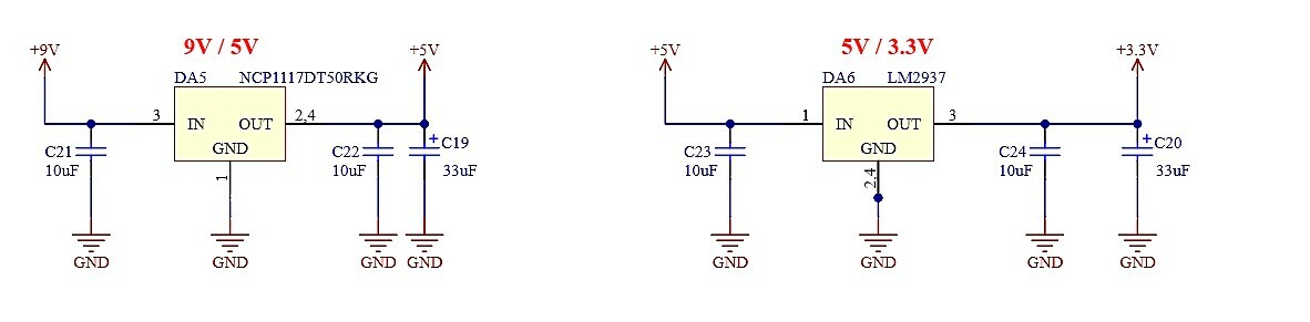 Применение импульсных преобразователей напряжения позволяет практически полностью избежать появления тепловой рассеиваемой мощности в преобразователе при этом обеспечивая токи в нагрузке до нескольких ампер. Одним из основных недостатков импульсных схем преобразования напряжения является повеление помех, вызванных коммутацией силового ключа в схеме преобразователя. Импульсные помехи и высокочастотные шумы являются нежелательными в аналого-цифровых системах, поэтому разработчики часто отказываются от импульсных преобразователей в пользу линейных. Типовые схемы простых линейных преобразователей напряжения: