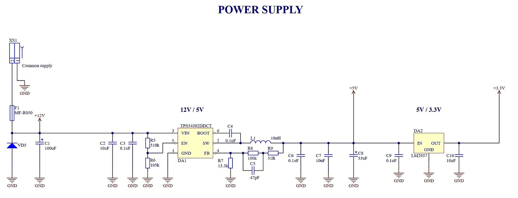 Решениями управления выходным напряжением при определенном, ограниченном диапазоне тока, который устанавливается согласно нагрузке, являются каскады на базе преобразователей напряжения. Известно, что схемы преобразователей напряжения глобально делятся на импульсные и линейные, каждая из которых имеет свои преимущества и недостатки. Типичная схема импульсного преобразователя напряжения с выходом +5В: