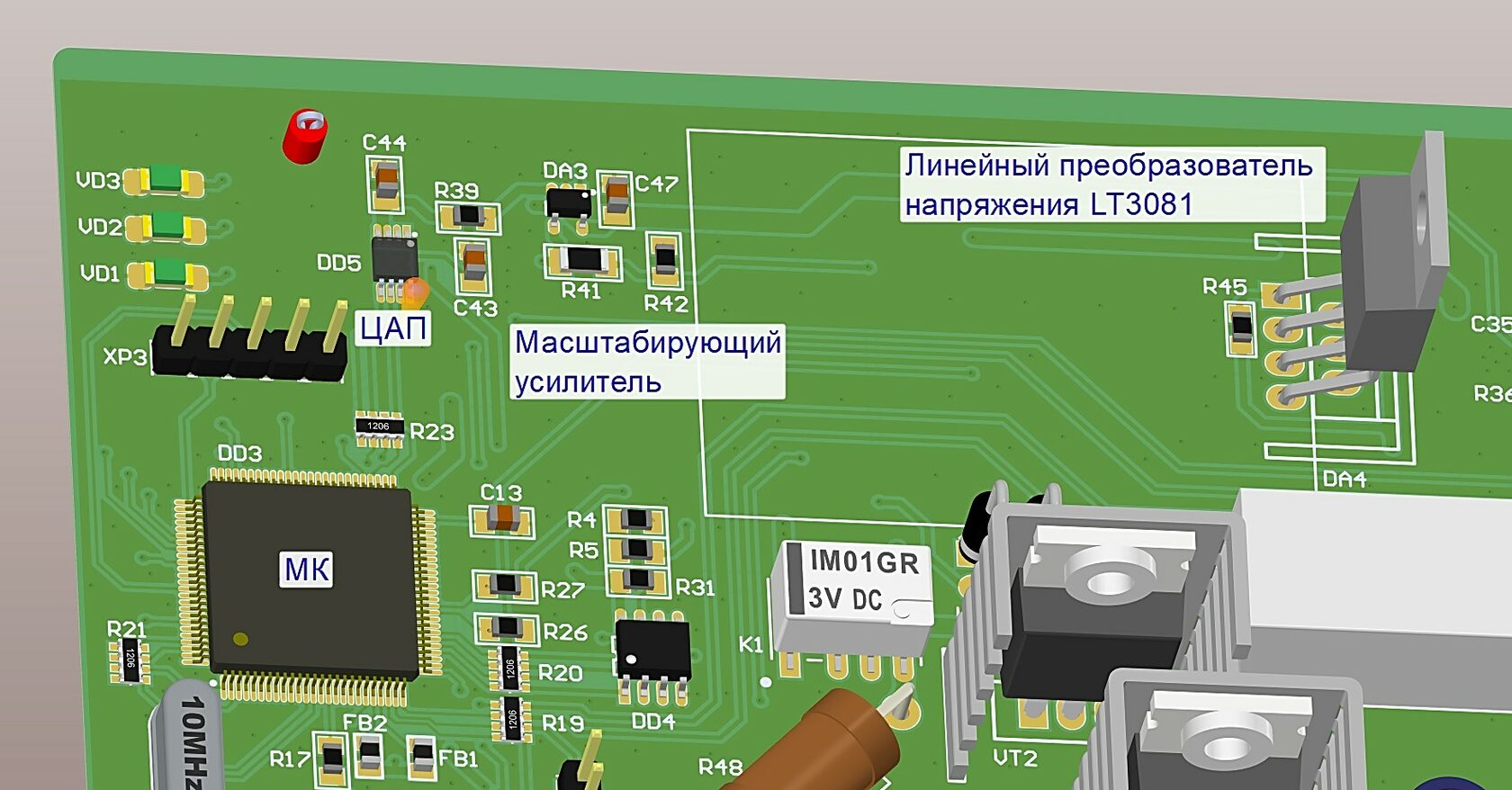ЦАП управляемый микроконтроллером через интерфейс SPI устанавливает выходное напряжение преобразователя в зависимости от команд пользователя. Напряжение управления масштабируется усилителем и поступает на вход SET микросхемы LT3081. Очевидно, что преобразователь на своем выходе устанавливает такое напряжение, которое в точности равно управляющему напряжению, приложенному к входу SET.
