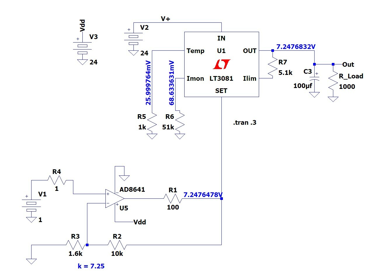 представляет собой продвинутый линейный преобразователь напряжения с возможностью установки выходного напряжения с помощью резистора. С помощью добавления несложного каскада управления микросхема LT3081 может стать основой линейного управляемого преобразователя напряжения. Процесс моделирования такой схемы в программе LTspice показана ниже.