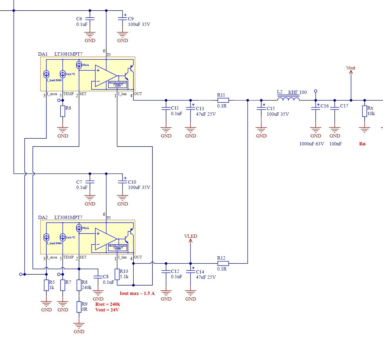 Сглаженное выходное напряжение трансформатора поступает на вход сдвоенного каскада линейного преобразователя на базе микросхем LT3081. Из схемы видно, что выходное напряжение устанавливается резисторами R8 и R9, в данной реализаций их величина равна 240 кОм и 0 Ом соответственно, что устанавливает выходное напряжение Vout = +24 В.