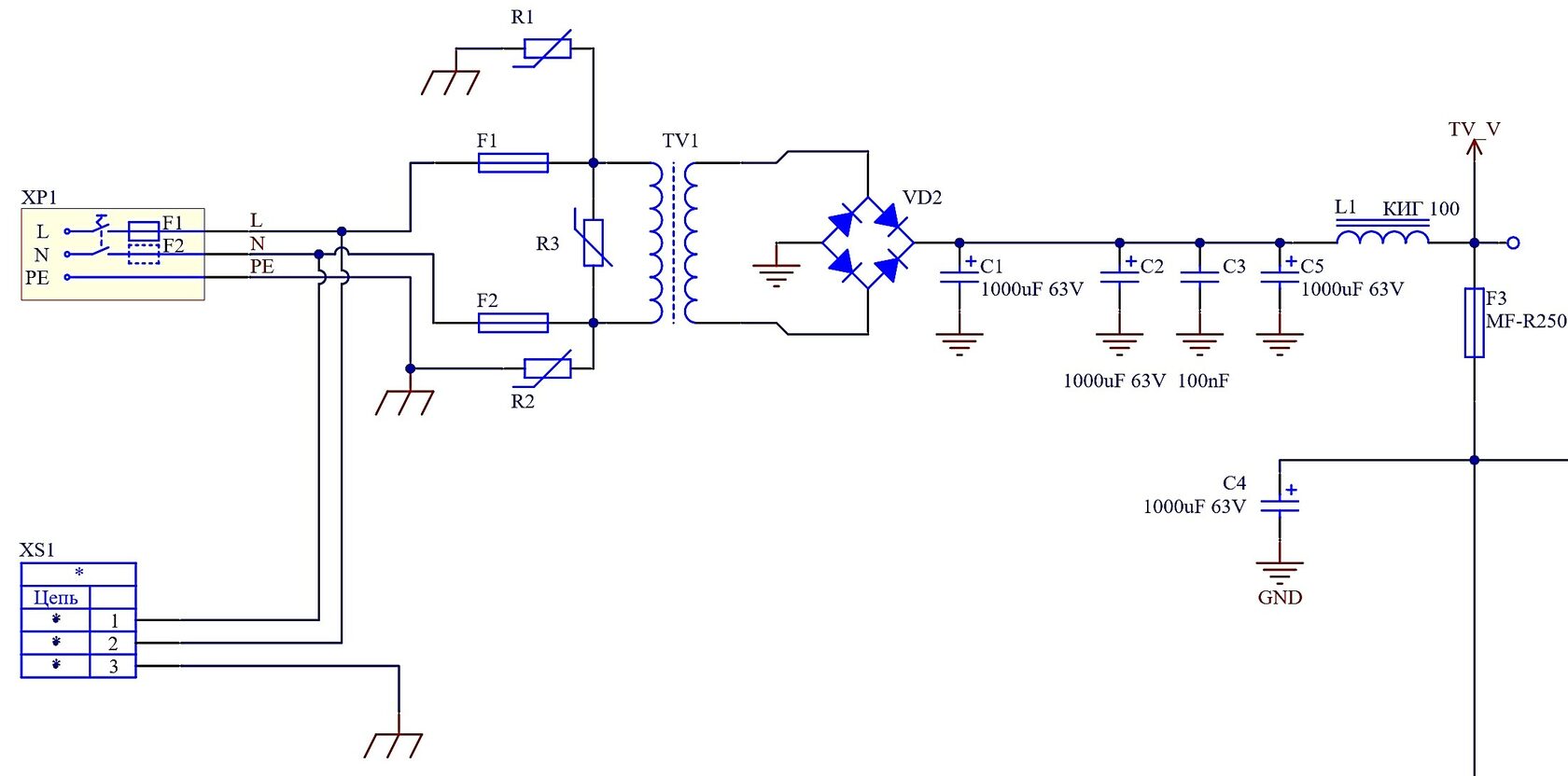 Основой источника питания является тороидальный трансформатор TV1 220/24В мощностью 30 Вт выходное напряжение которого поступает на диодный мост VD1 двухполупериодного выпрямителя и далее выравнивается в постоянное напряжение без пульсаций с помощью накопительных конденсаторов С1, C2, C5. LC-фильтр L1/С4 является дополнительным элементом, уменьшающим пульсации выходного напряжения.