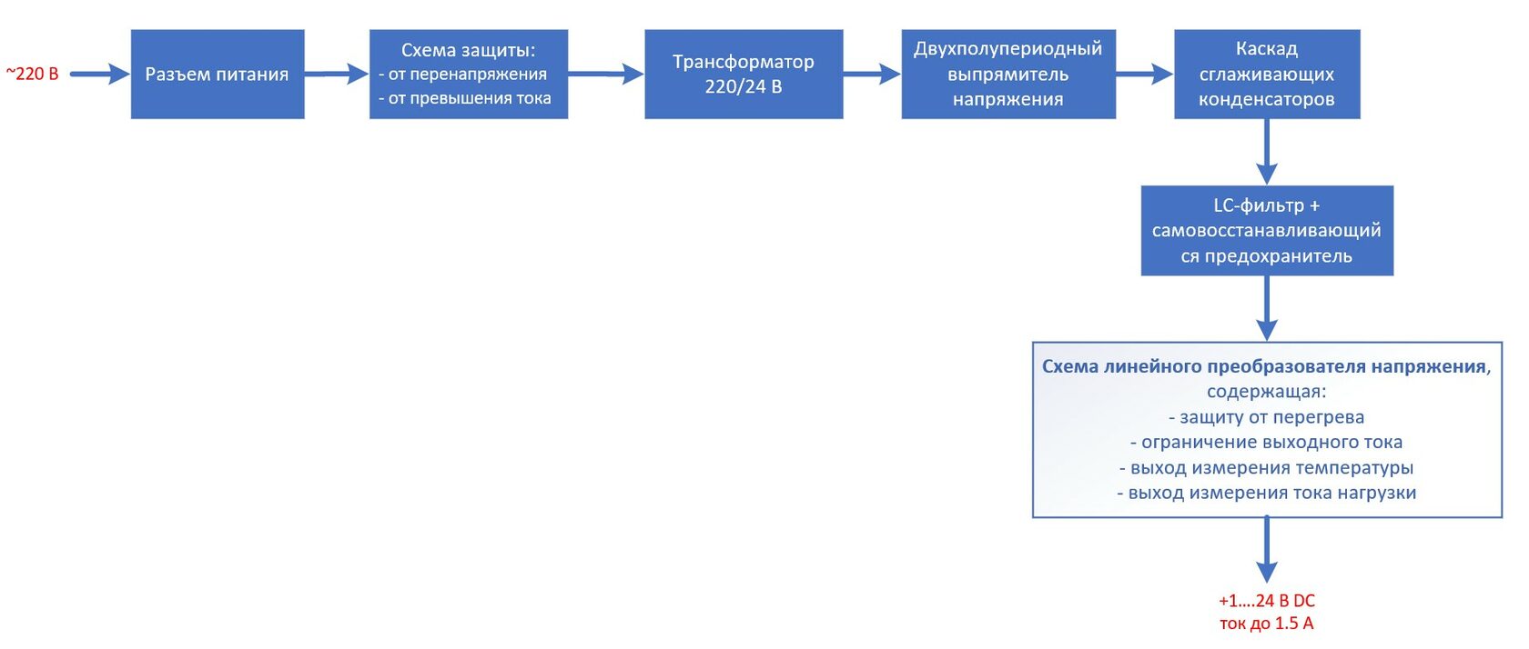Блок-схема малошумящего линейного источника питания выглядит следующим образом: