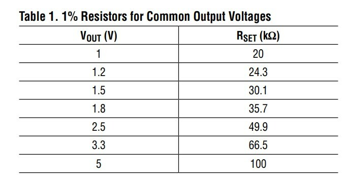 Изменяя суммарное значение сопротивления в цепи SET (вывод 2 микросхем) с помощью резисторов R8 и R9 можно установить любое напряжение в диапазоне рабочих напряжений микросхемы LT3081. Таблица, взятая из спецификации микросхемы LT3081, обобщает зависимость выходных напряжений от величины сопротивления резистора, подключенного к выводу SET.